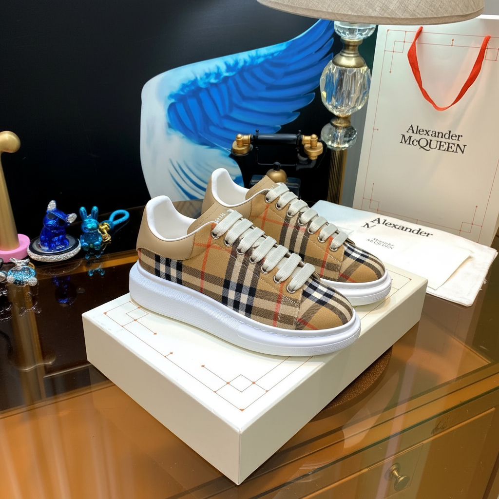 Alexander McQueen plaid low-top sneakers with chunky white sole, stylish lace-up design, premium materials, perfect for casual and trendy streetwear fashion.