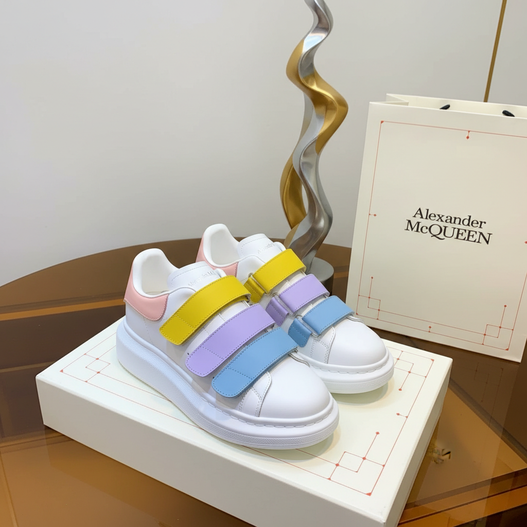 Alexander McQueen white sneakers with pastel pink, yellow, purple, and blue velcro straps, stylish chunky sole design for trendy casual wear.