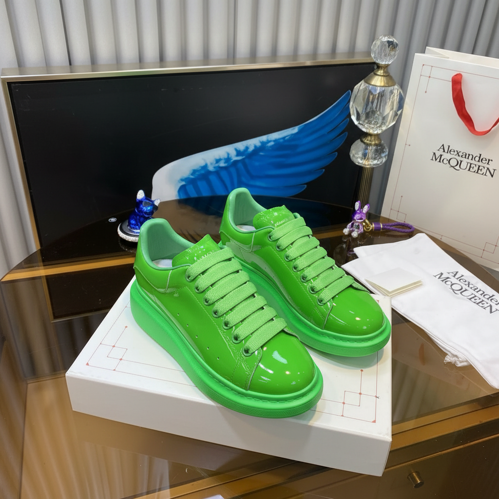 Alexander McQueen Green Patent Leather Sneakers, bold glossy finish, chunky sole, luxury designer casual shoes for fashion-forward style.