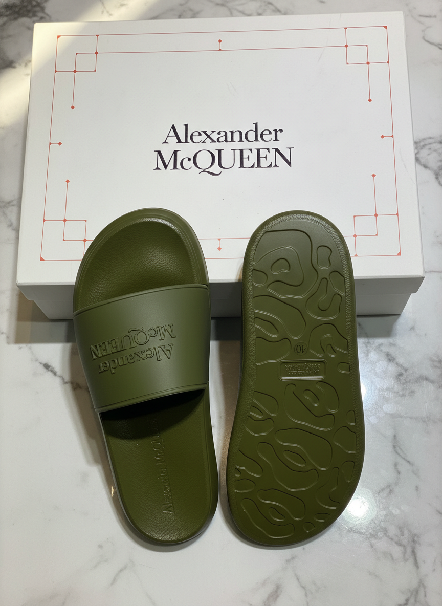 Alexander McQueen Olive Green Slide Sandals, stylish comfort footwear with signature logo design, perfect for casual wear and summer essentials.
