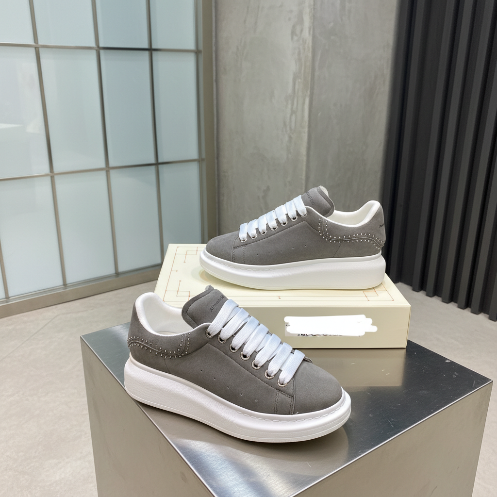Alexander McQueen grey suede oversized sneakers with white laces, studded details, and chunky sole, perfect for stylish casual wear and luxury fashion lovers.