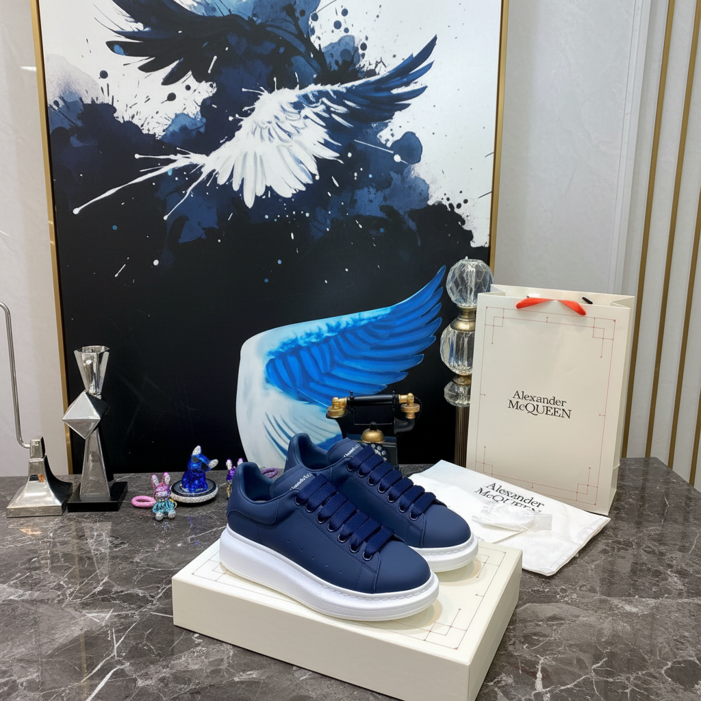 Alexander McQueen navy leather oversized sneakers with chunky white sole, stylish lace-up design, and premium craftsmanship for a trendy and comfortable look.