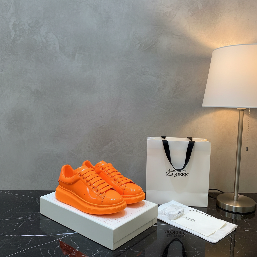Alexander McQueen oversized orange sneakers with glossy finish, bold fashion design, premium quality, perfect for street style and casual wear.