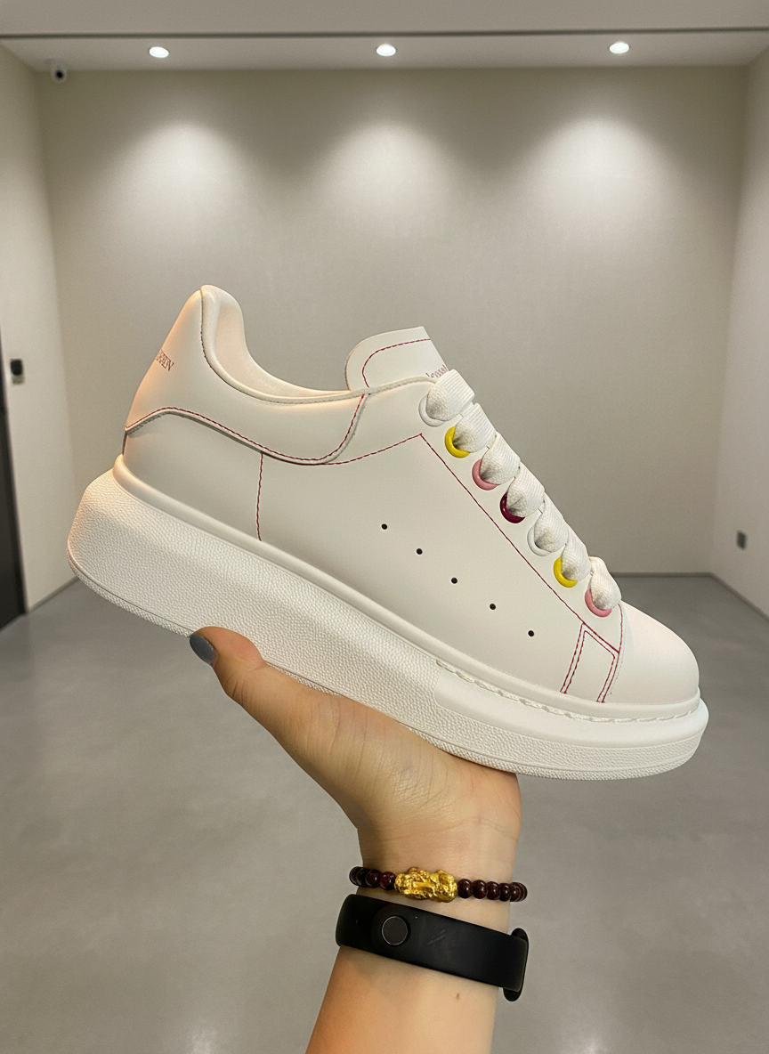 Alexander McQueen oversized white leather sneakers with colorful eyelets, red stitching, and chunky sole, perfect for stylish casual wear and all-day comfort.