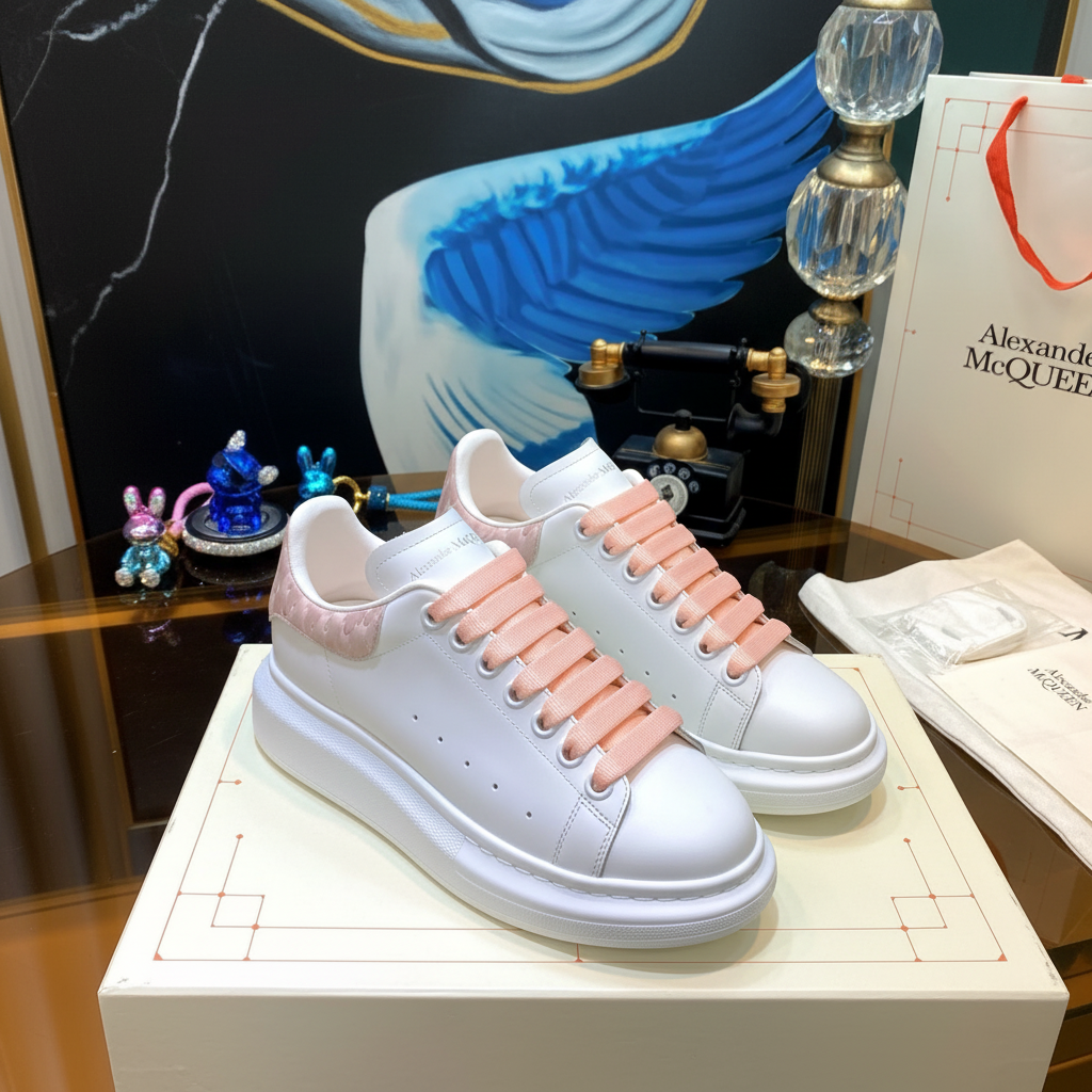 Alexander McQueen white leather sneakers with pink laces and heel detail, stylish oversized sole, perfect for casual fashion and luxury streetwear looks.
