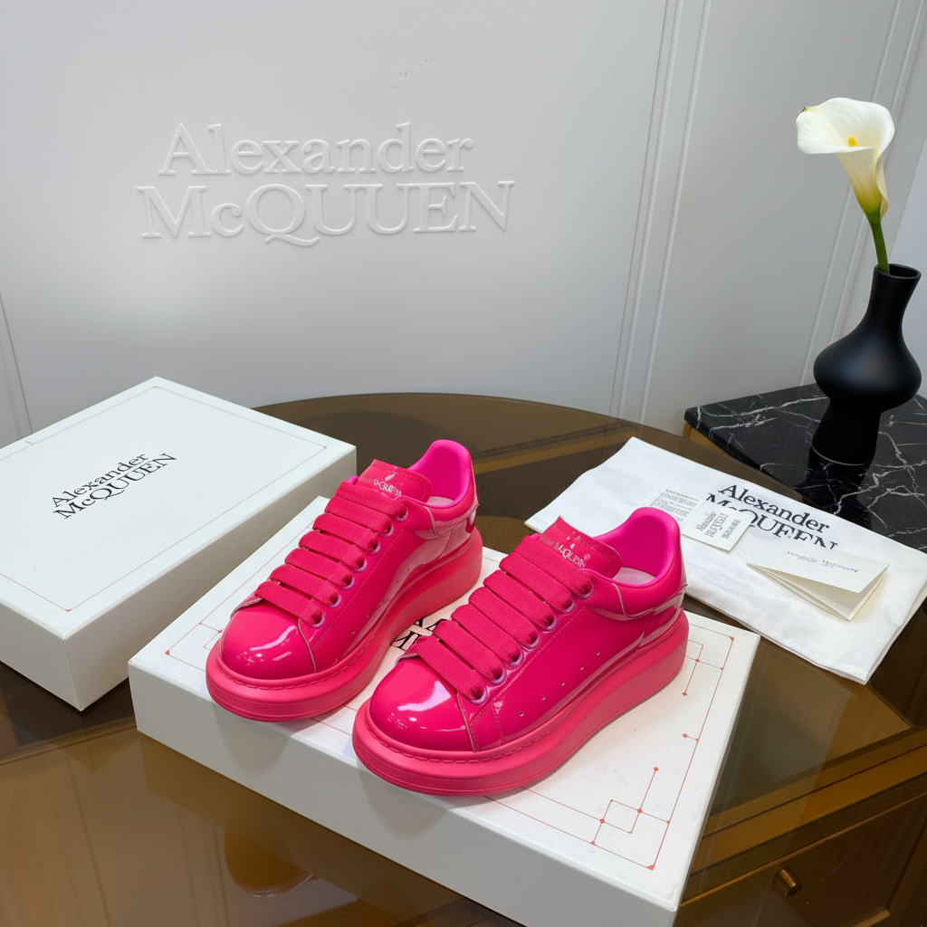 Alexander McQueen oversized sneakers in vibrant hot pink with glossy finish, bold style, and comfort, perfect for fashion-forward streetwear lovers.
