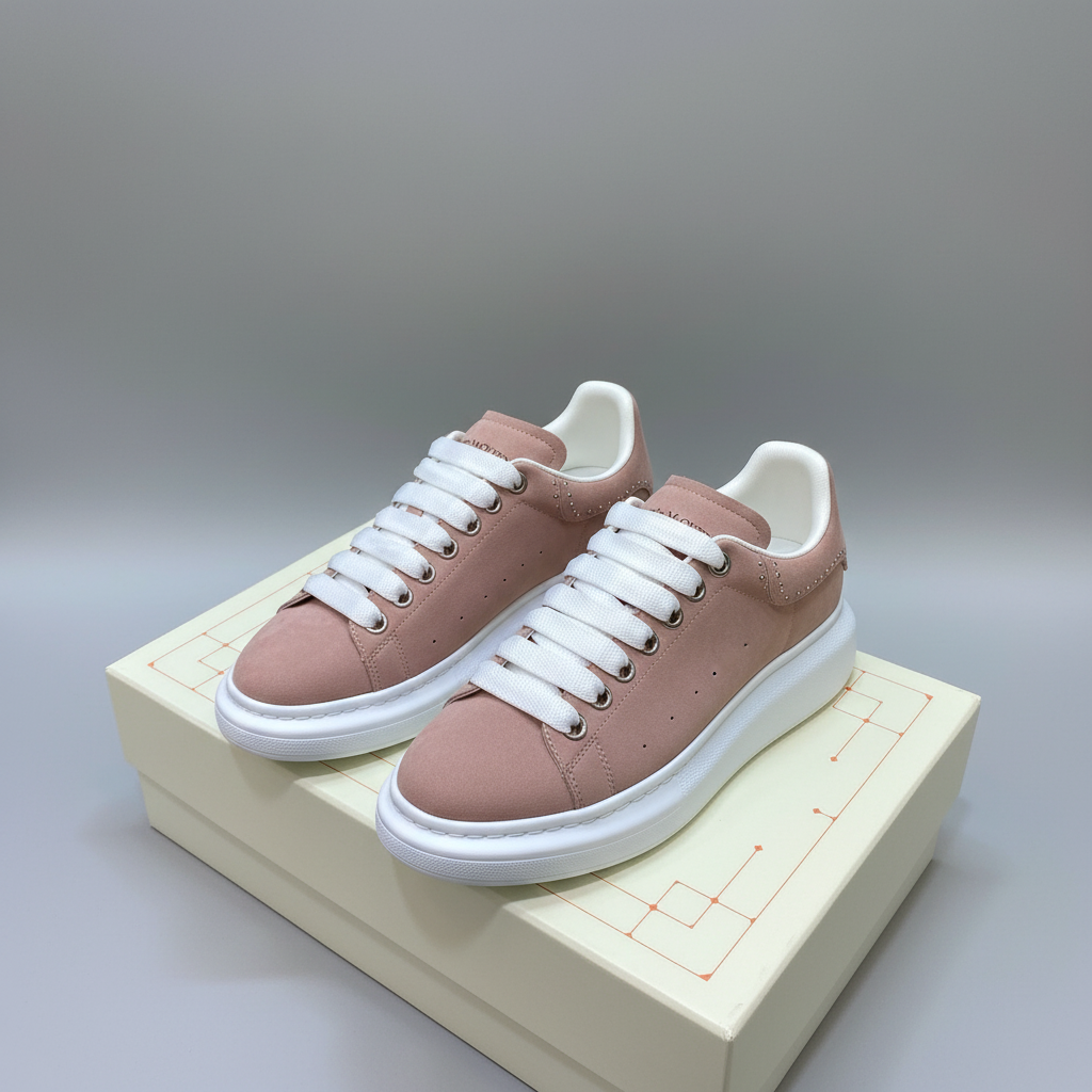 Alexander McQueen pink suede sneakers with white laces, stylish design, premium craftsmanship, and comfortable fit for everyday fashion and luxury streetwear.