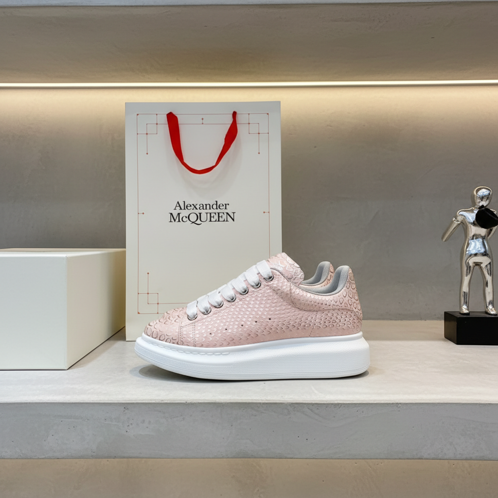 Alexander McQueen Pink Embossed Leather Sneakers, stylish luxury shoes with textured design, chunky white sole, and premium craftsmanship for fashion-forward comfort.