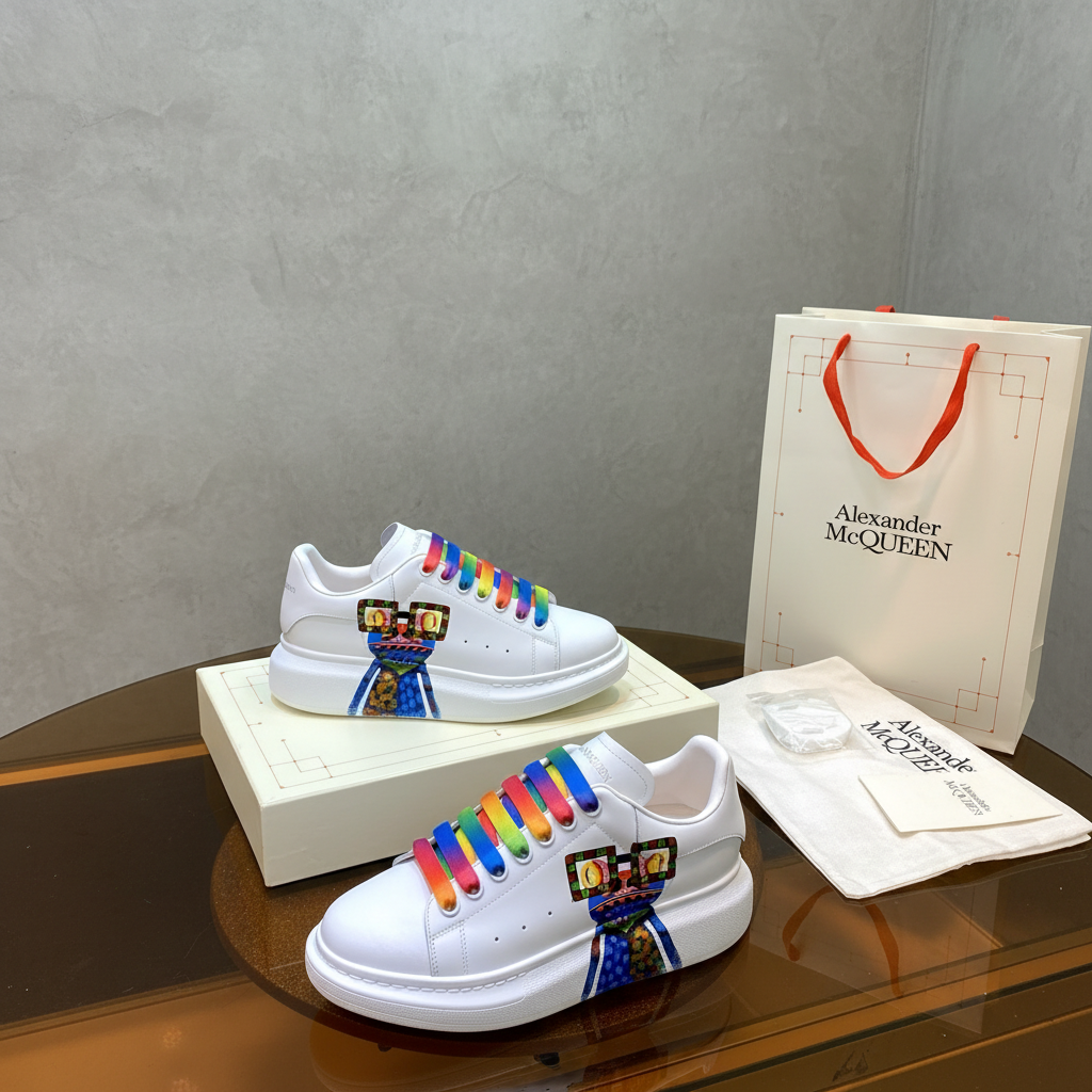 Alexander McQueen white sneakers with vibrant rainbow laces and colorful artistic bow design, combining luxury style with bold, eye-catching details for a unique fashion statement.