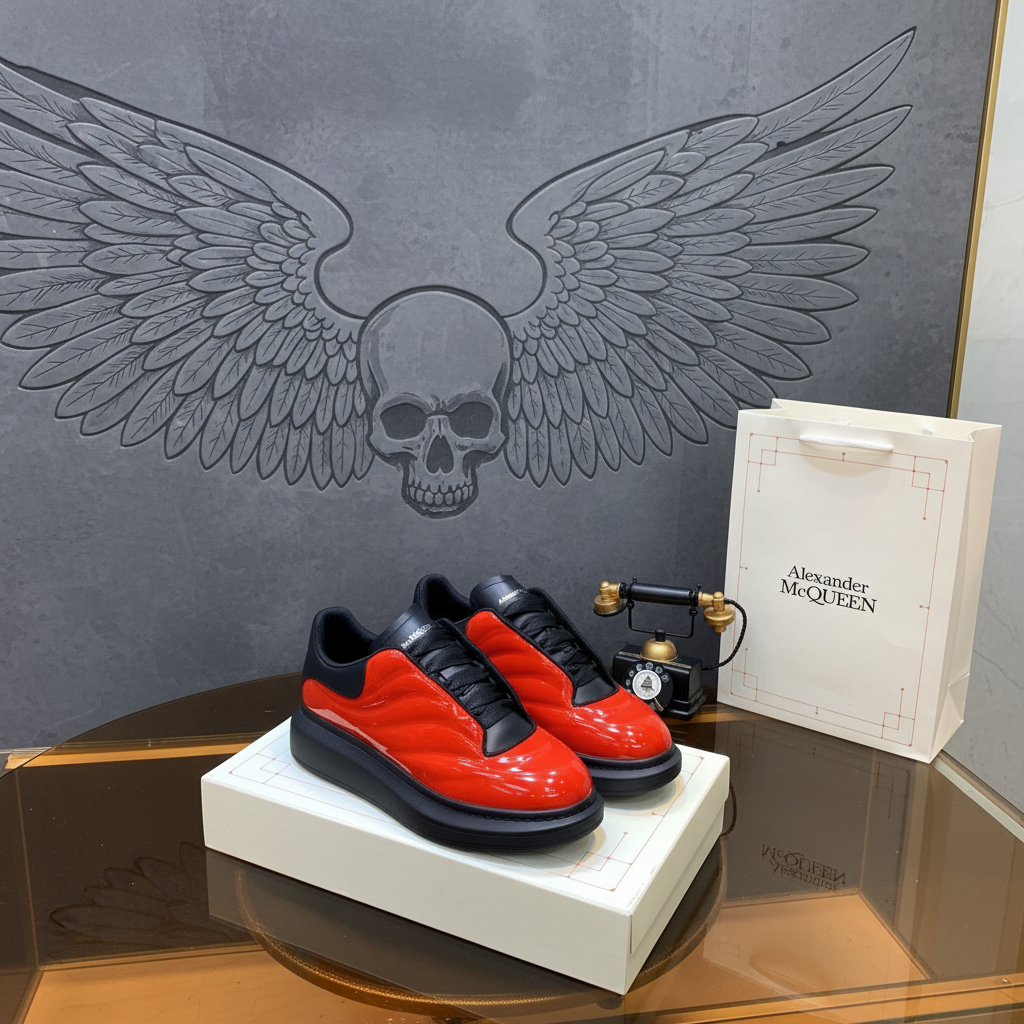 Alexander McQueen Red Glossy Leather Sneakers with Black Soles, Stylish Luxury Footwear for Men and Women, Perfect for Casual or Fashion-Forward Looks.