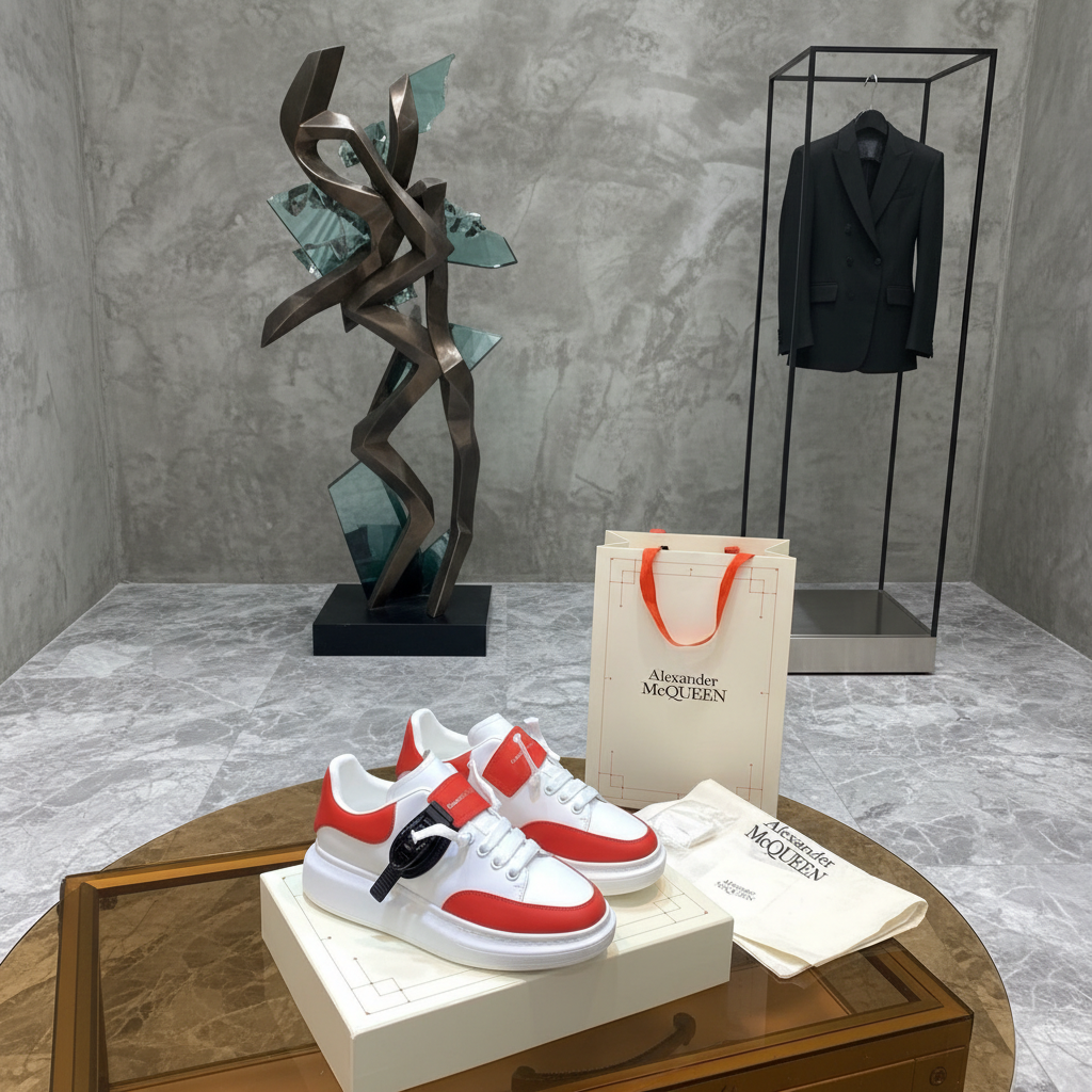 Alexander McQueen white and red leather oversized sneakers, stylish design with bold color contrast, perfect for casual wear and street fashion.