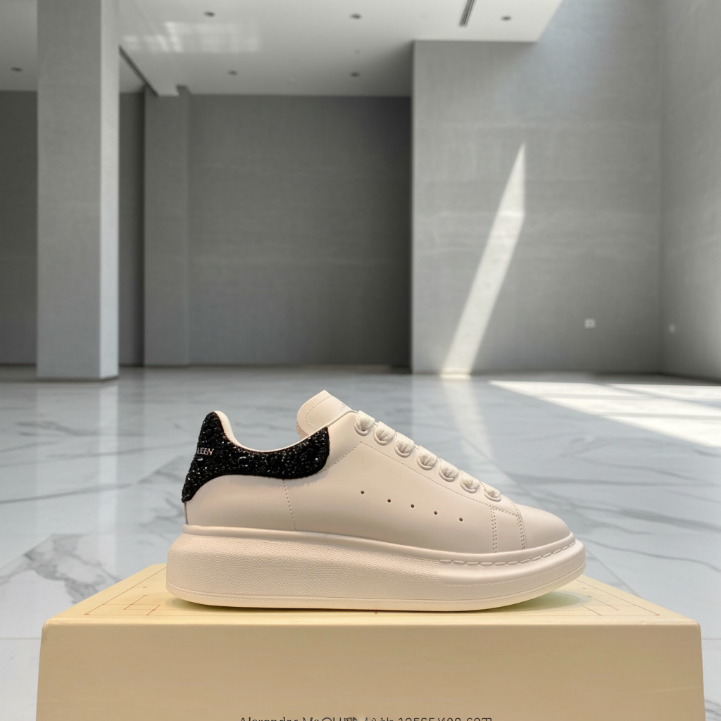 Alexander McQueen white leather sneakers with oversized sole and black glitter heel tab, stylish and comfortable for everyday casual wear.