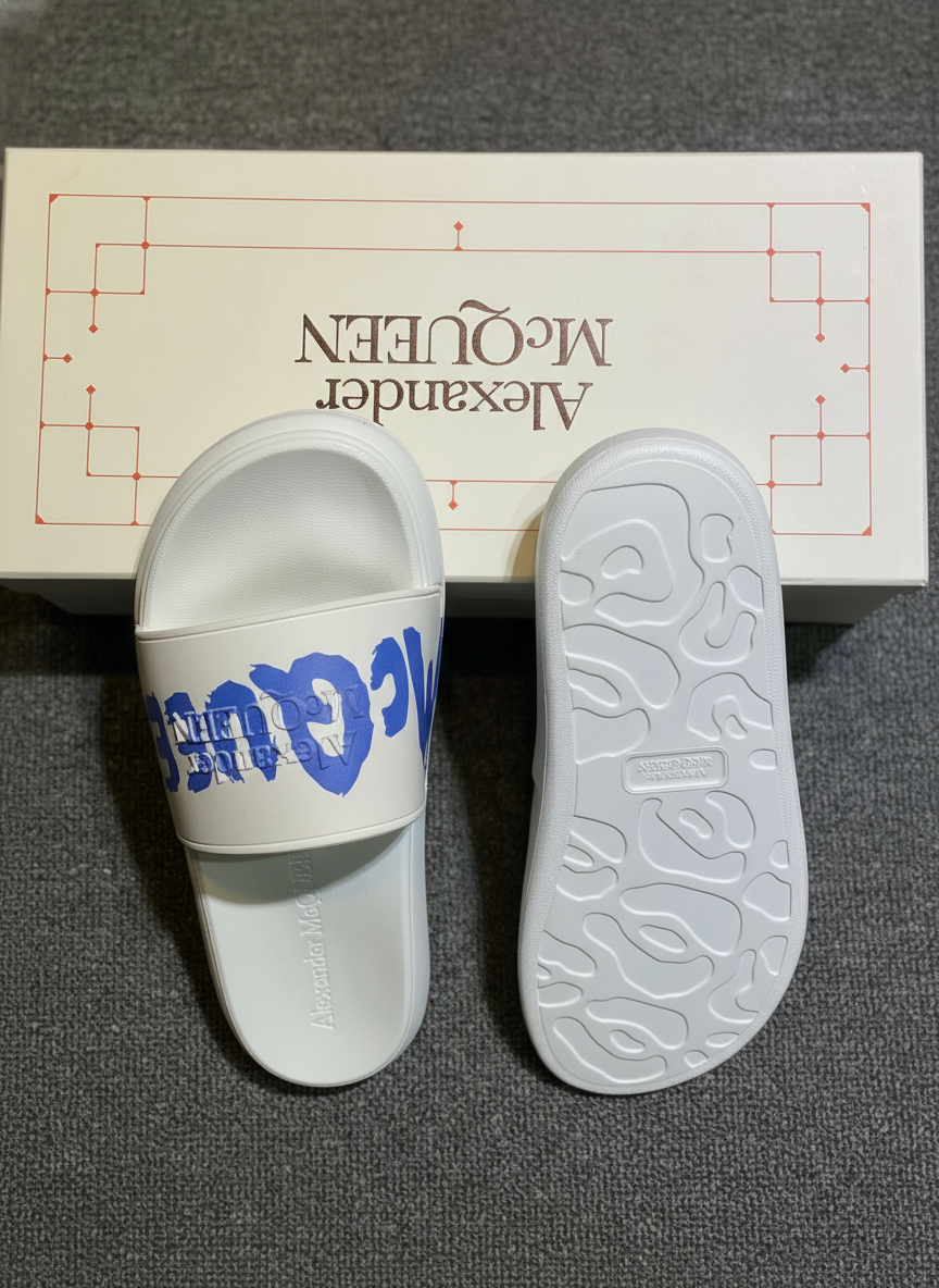Alexander McQueen White Blue Logo Slide Sandals