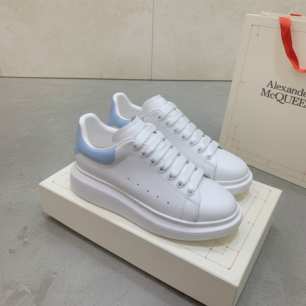 Alexander McQueen white leather oversized sneakers with light blue heel detail, stylish lace-up design, and chunky sole for a bold, modern streetwear look.
