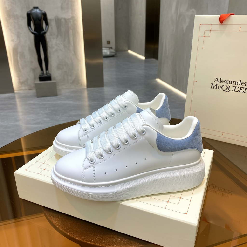 Alexander McQueen white leather oversized sneakers with light blue suede heel detail, stylish design, premium comfort, perfect for casual and trendy streetwear looks.