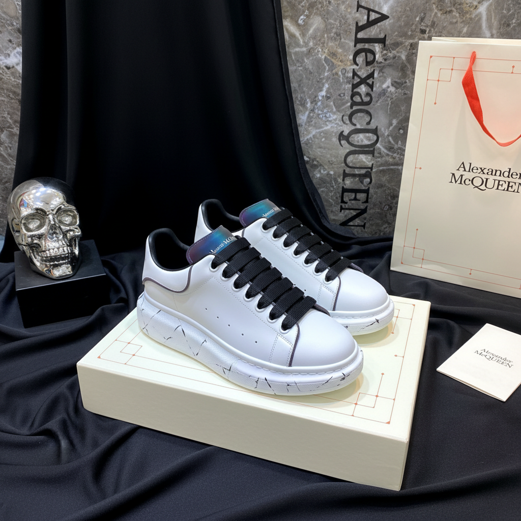 Alexander McQueen white leather oversized sneakers with black laces, stylish design, and unique patterned sole, perfect for fashion-forward casual wear.