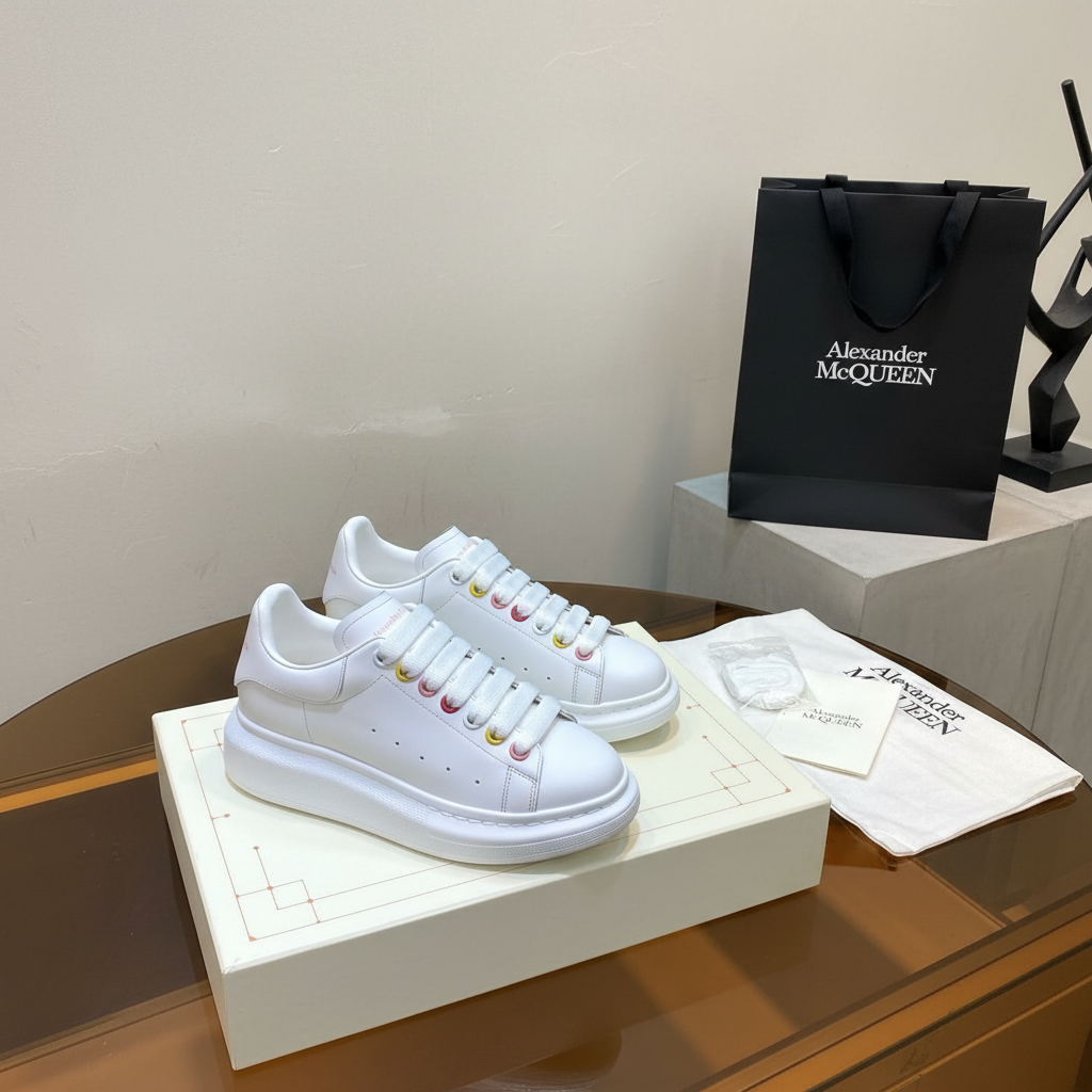 Alexander McQueen white leather oversized sneakers with rainbow eyelets, stylish design, premium comfort, perfect for casual wear and fashion lovers.
