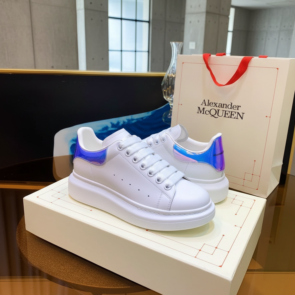 Alexander McQueen white leather sneakers with iridescent heel detail, oversized sole, and modern minimalist design for stylish everyday wear.