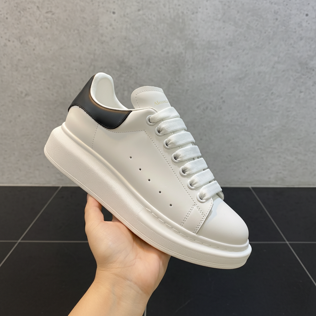 Alexander McQueen white leather sneakers with oversized sole, black heel detail, and lace-up design for a stylish and comfortable everyday look.