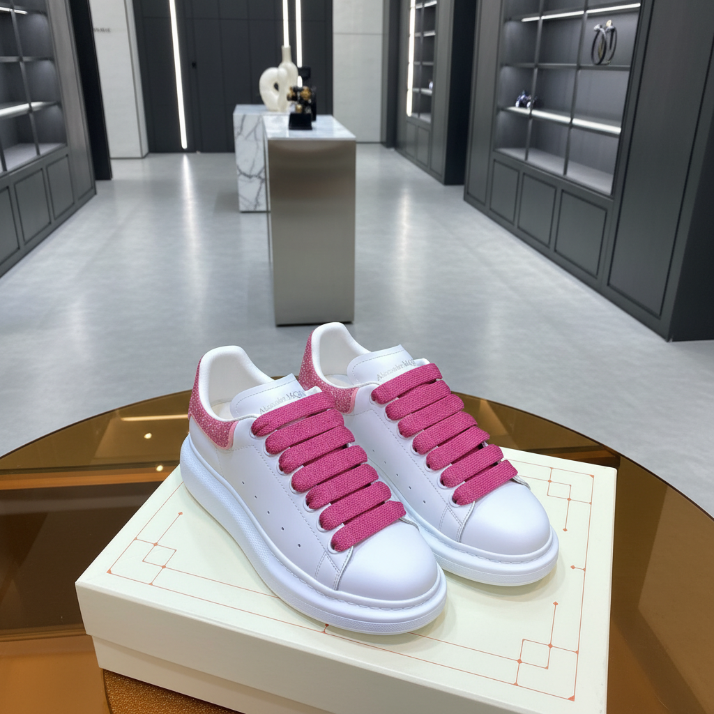 Alexander McQueen white leather sneakers with bold pink glitter laces, stylish and comfortable design perfect for casual wear and fashion-forward looks.