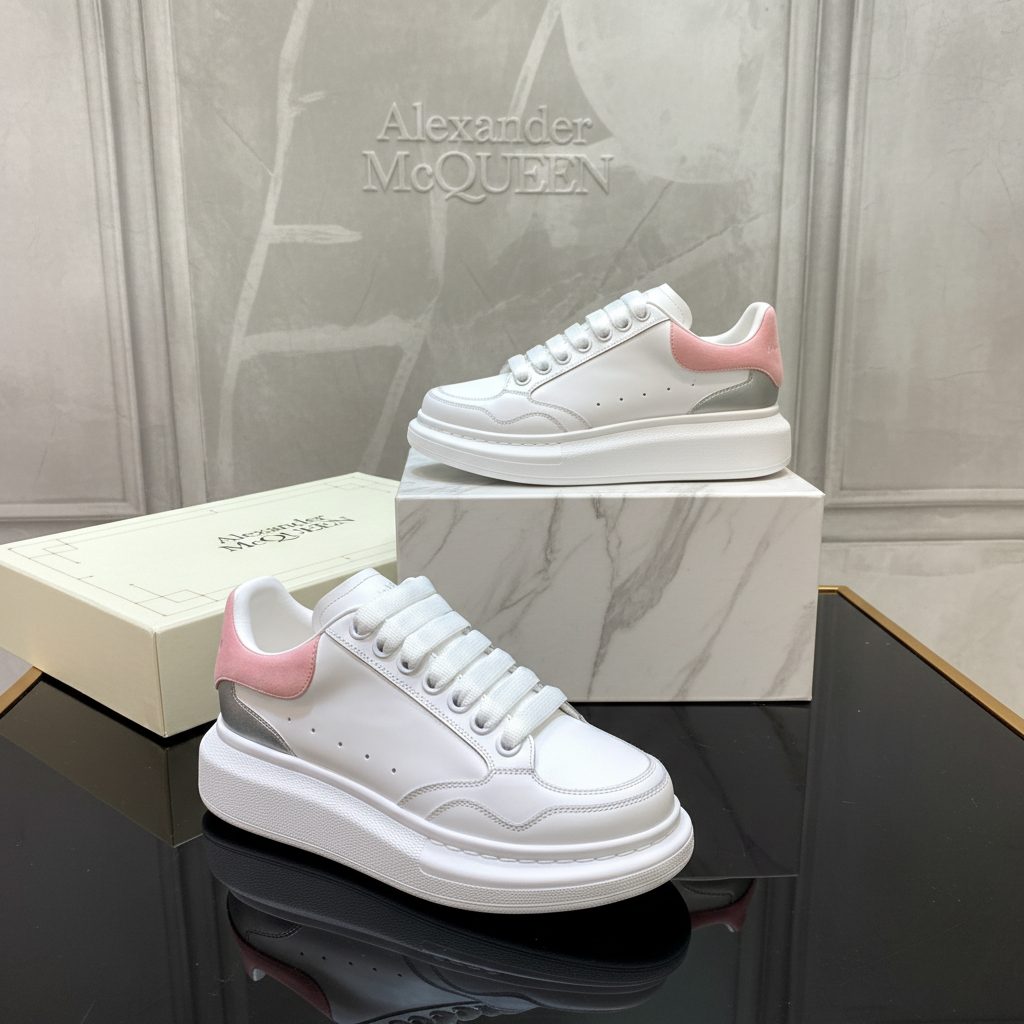 Alexander McQueen White Leather Sneakers with Pink Heel Detail, Stylish Oversized Sole Casual Shoes for Women, Luxury Designer Footwear for Everyday Fashion