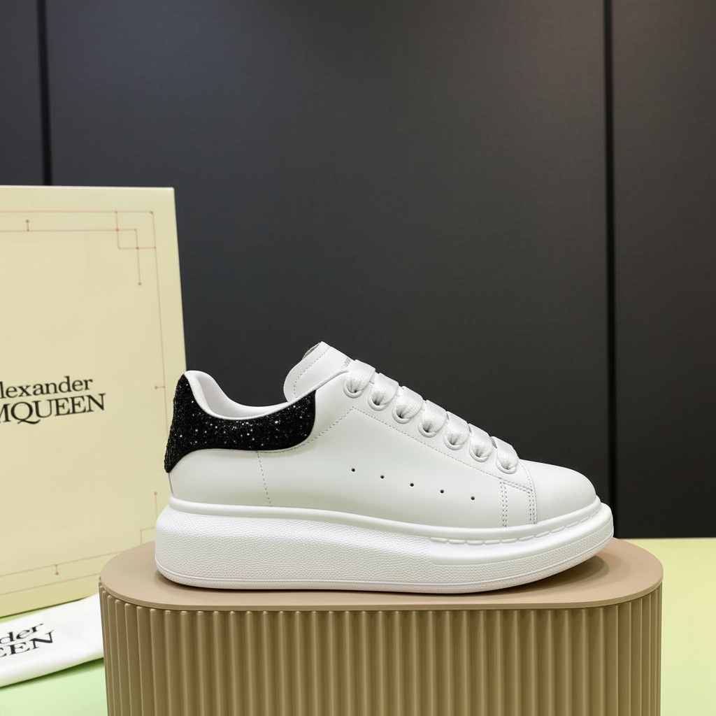 Alexander McQueen white leather oversized sneakers with black glitter heel detail, stylish lace-up design, and elevated sole for a bold and modern look.