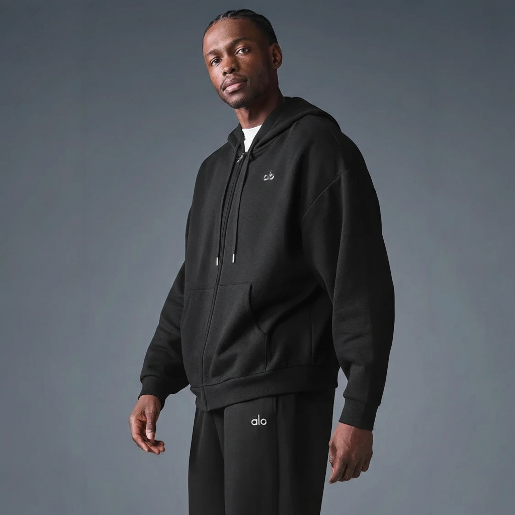 Alo Men’s Black Zip-Up Hoodie, premium cotton blend, relaxed fit with drawstring hood and kangaroo pocket, perfect for casual wear, workouts, and street style fashion.