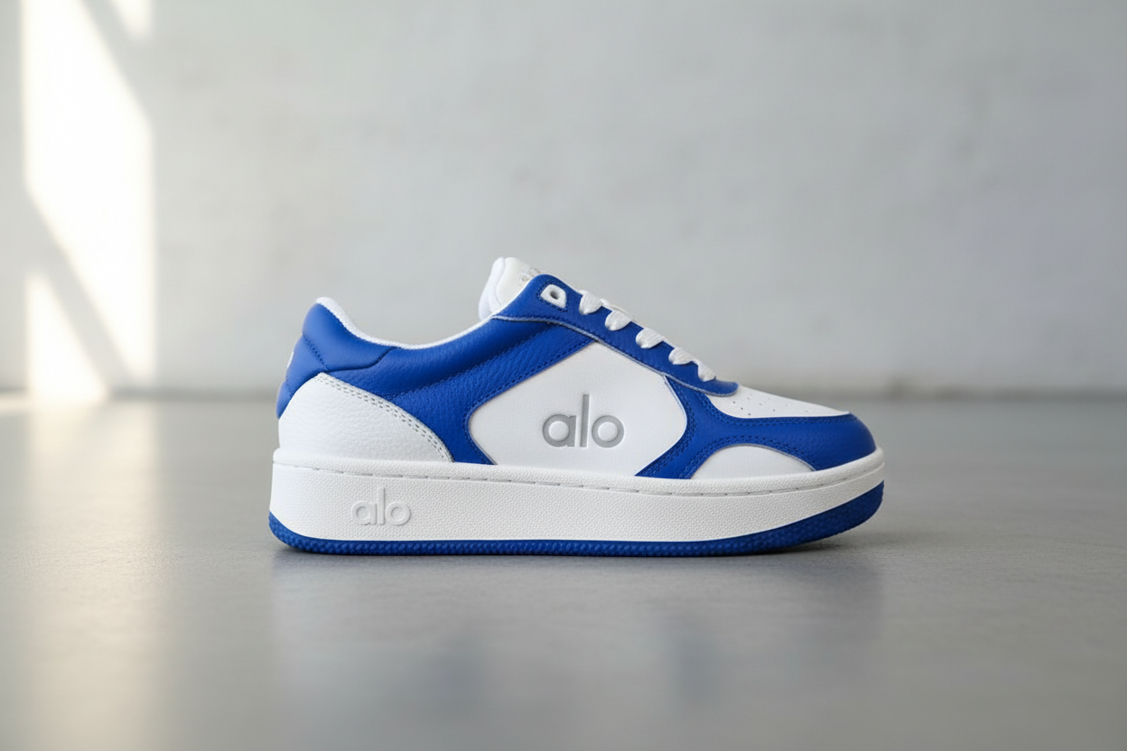 Alo Yoga blue and white leather sneakers, stylish low-top design with logo detail, durable sole for comfort and everyday wear.