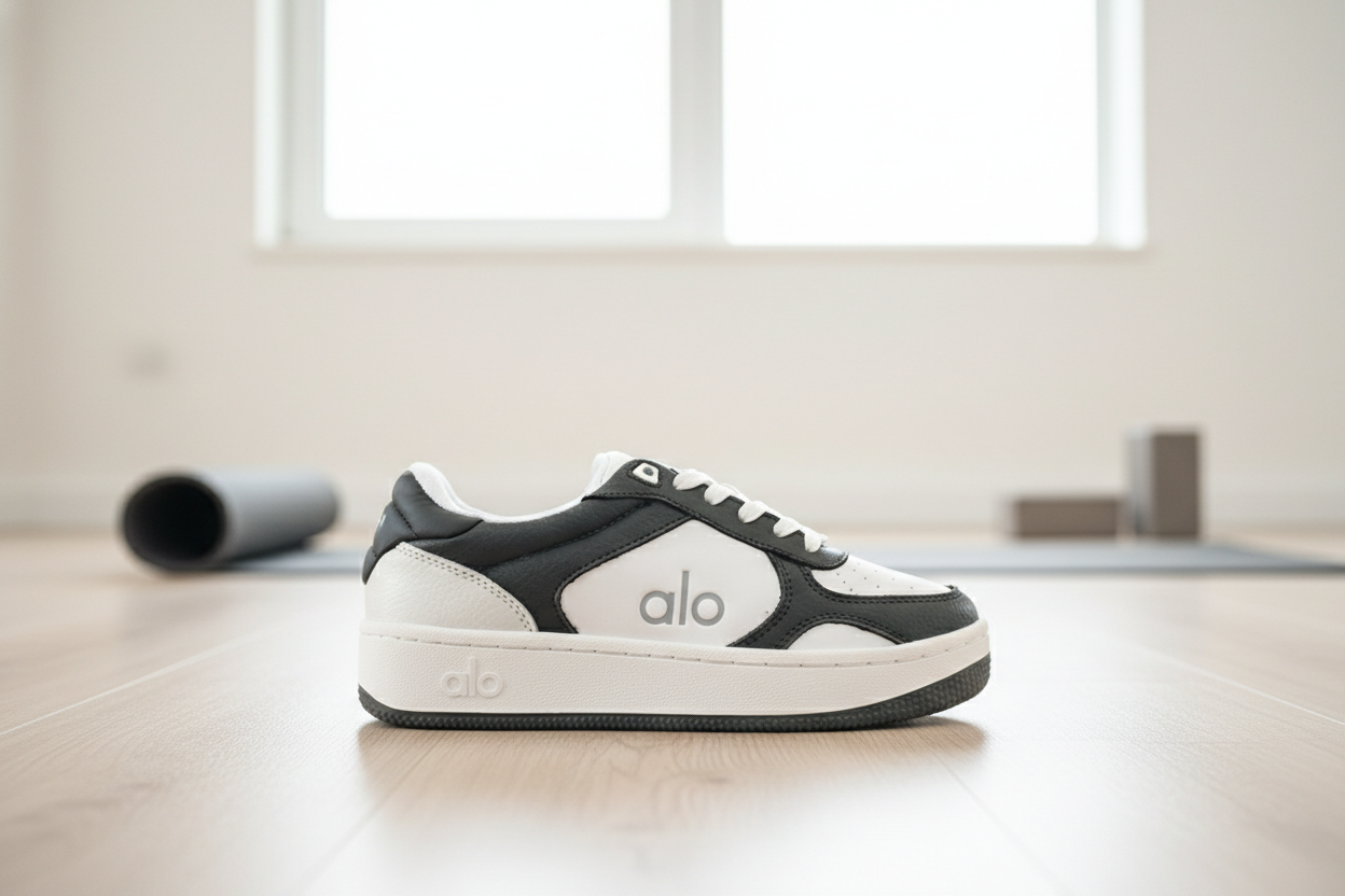 Alo Yoga Sneakers – stylish black and white leather casual shoes for women, breathable comfort, sporty design, perfect for everyday wear and fitness fashion.