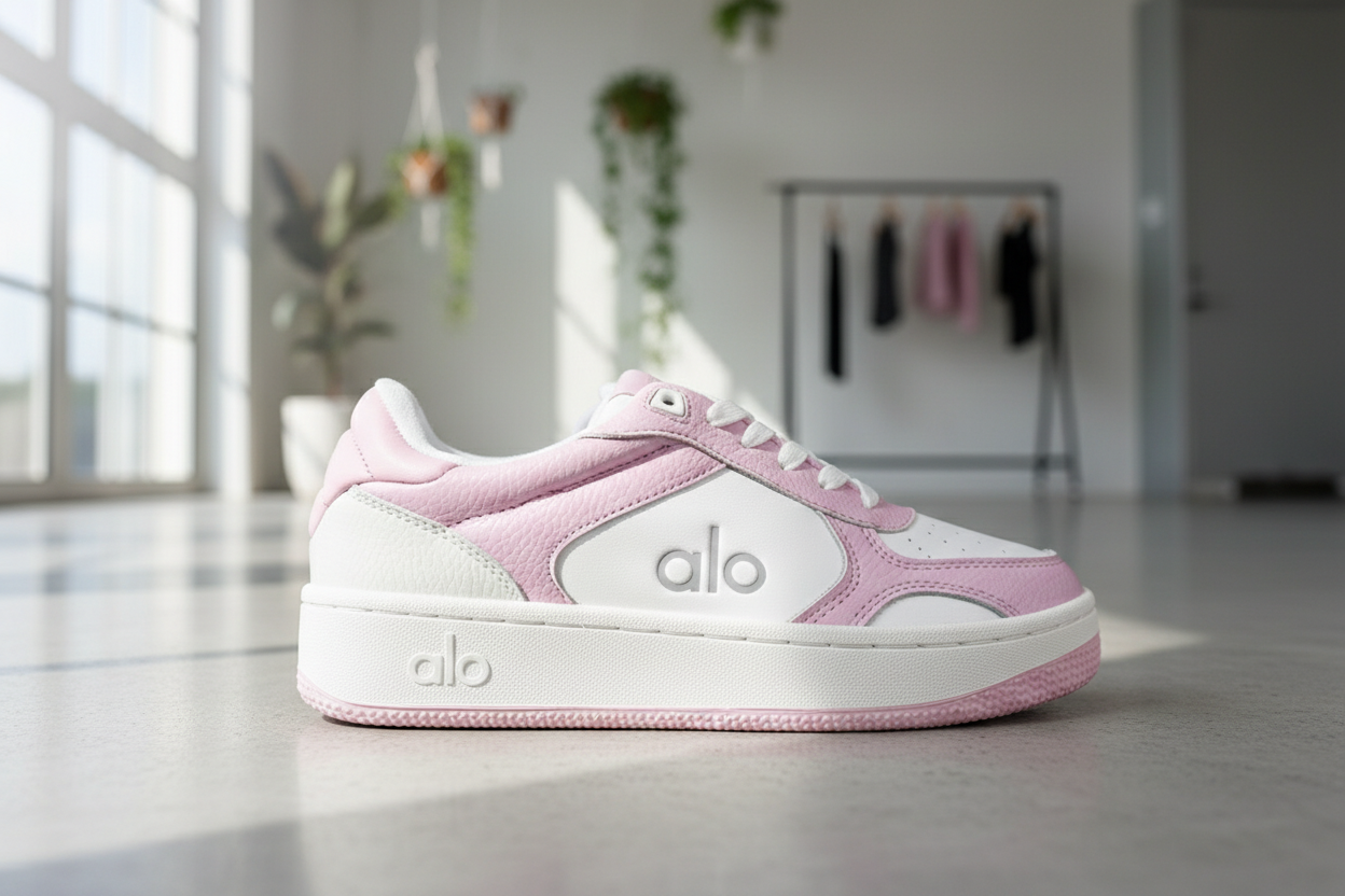 Alo Yoga Women’s Pink White Sneakers, stylish platform design, soft leather upper, breathable comfort, perfect for yoga, casual wear, and everyday sporty fashion.