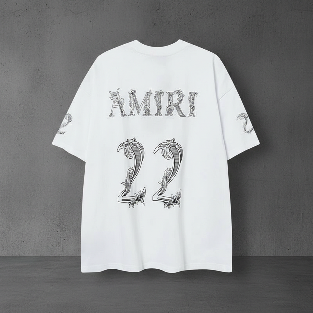 Amiri white graphic T-shirt with bold vintage-inspired “22” print and ornate logo design, perfect for stylish casual wear and street fashion lovers.