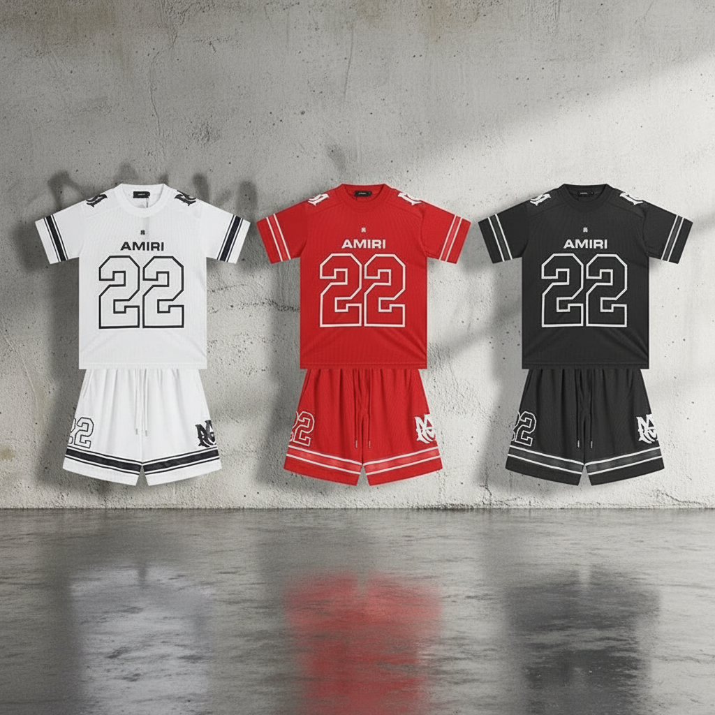 AMIRI Men’s Sportswear Set, Jersey Top and Shorts, Number 22 Design, Casual Athletic Outfit in White, Red, Black for Summer Training and Streetwear Style.
