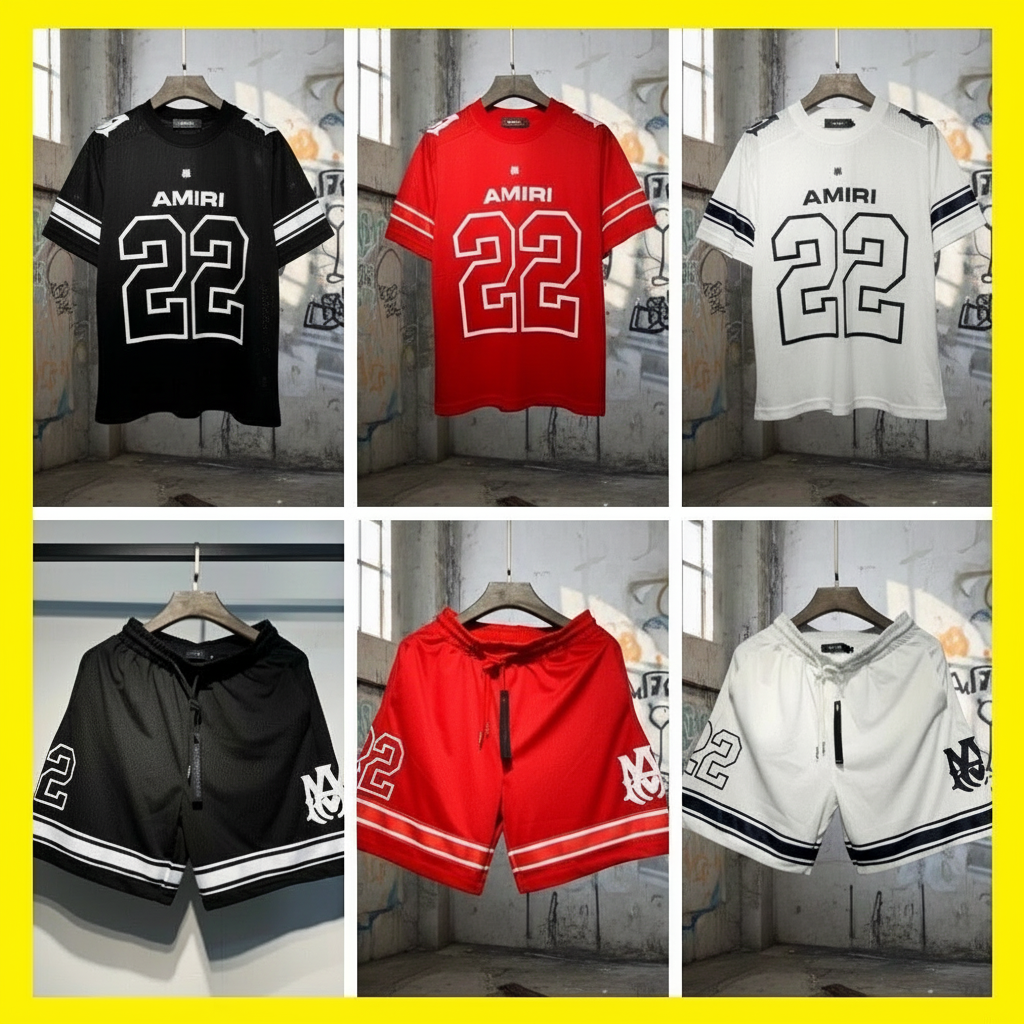 Amiri sports set with jersey and shorts, bold 22 print, breathable fabric, available in black, red, and white, perfect for casual wear and street style.