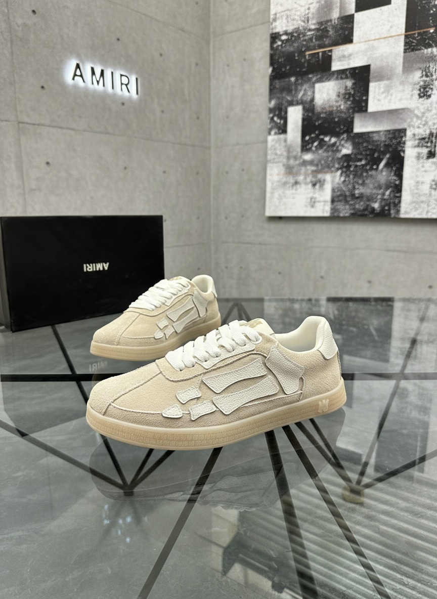 Amiri beige suede low-top sneakers with unique layered panel design, premium craftsmanship, and casual streetwear style for everyday comfort.