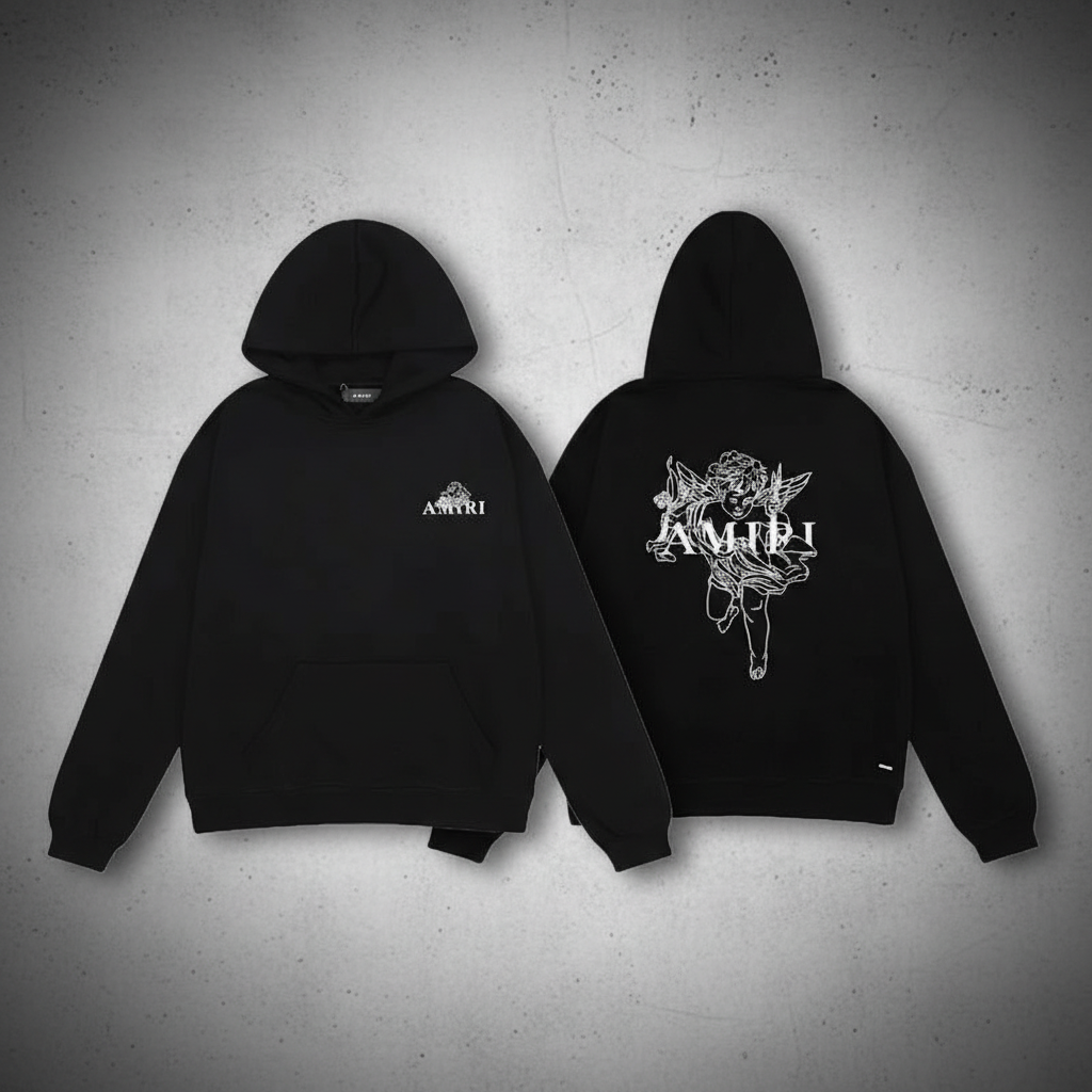 Amiri Black Hoodie with Angel Graphic, premium cotton, streetwear style, comfortable fit, perfect for casual wear and layering.