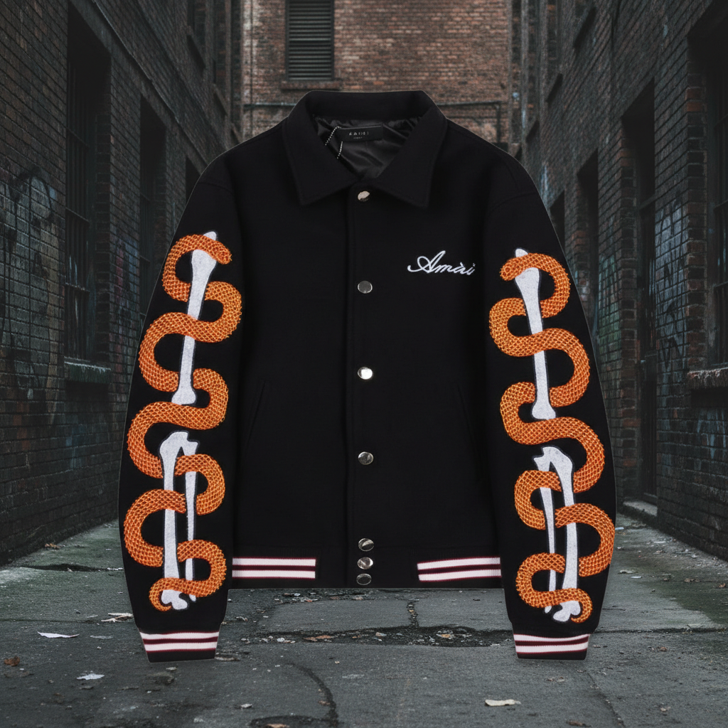 Amiri Black Varsity Jacket with Orange Snake Embroidery, Stylish Streetwear Outerwear for Men and Women
