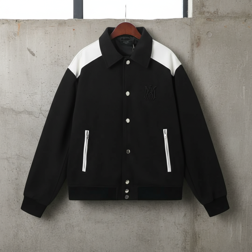 Amiri Men’s Black and White Varsity Jacket, premium wool blend, classic snap-button design, embroidered logo, streetwear style for casual or fashionable layering, perfect for all seasons.