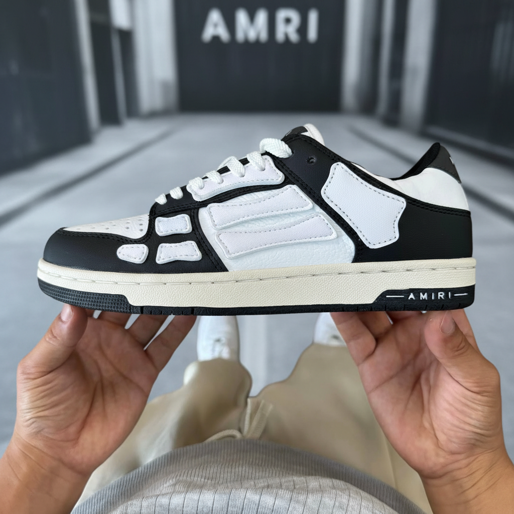 Amiri black and white leather low-top sneakers with premium craftsmanship, retro-inspired design, and comfortable rubber sole for everyday streetwear style.