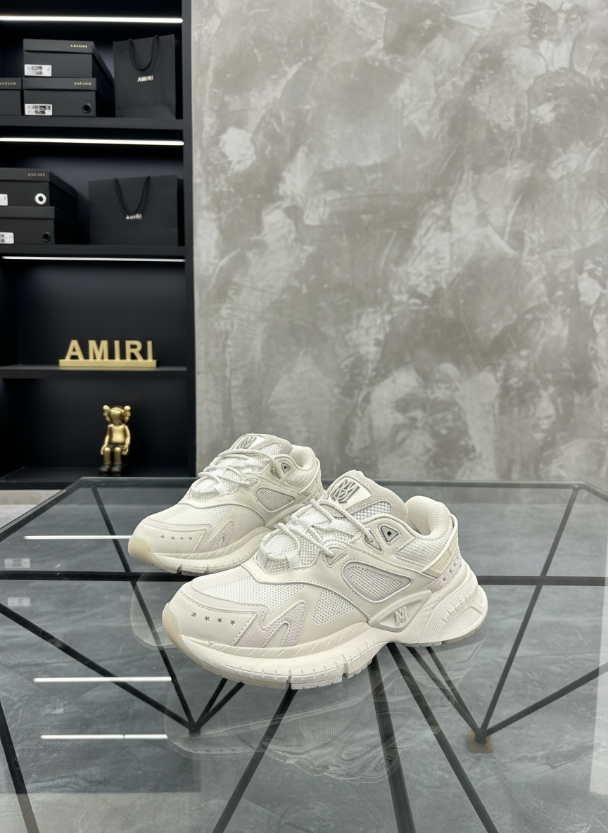 Amiri White Mesh Leather Sneakers, stylish chunky sole design, breathable comfort, perfect for casual wear and street fashion.