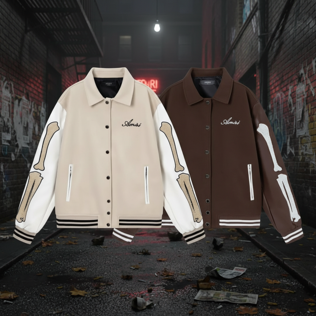 Amiri Jackets – Stylish varsity jackets with bone embroidery, premium fabric, classic button closure, and streetwear design for men and women. Perfect for casual or urban fashion outfits.
