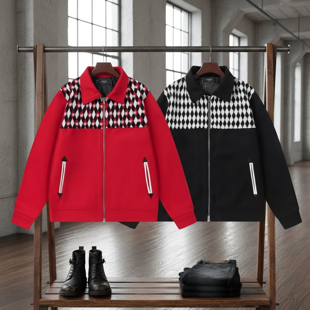 Amiri diamond pattern zip-up jackets, stylish streetwear in red or black, perfect for casual and trendy looks.