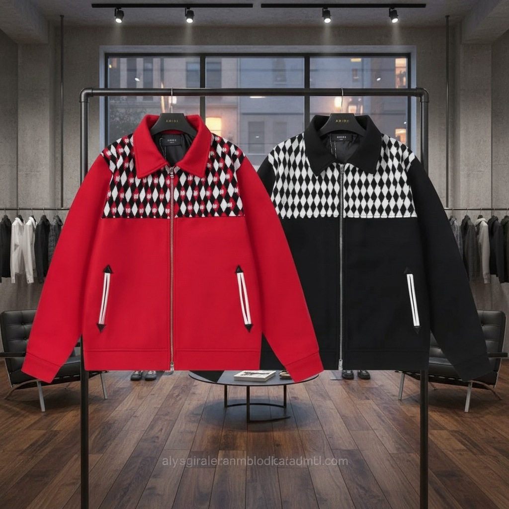 Amiri jackets with bold diamond pattern, zip front, and side pockets, offering stylish comfort in red or black for modern streetwear fashion.