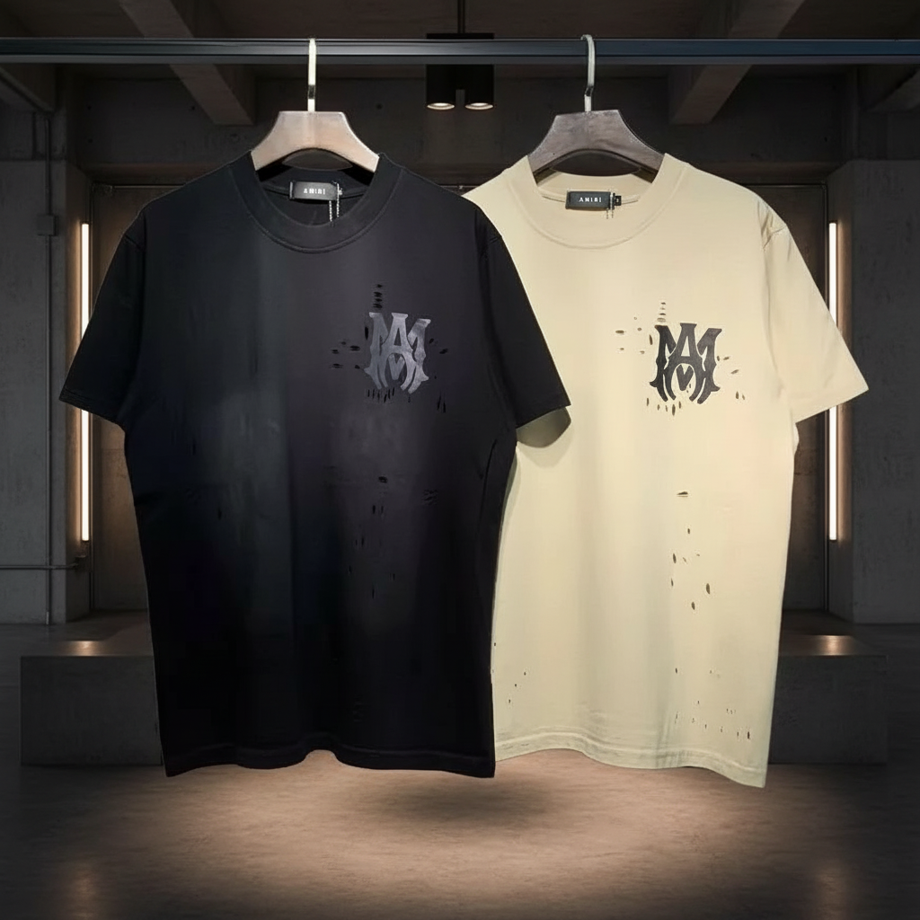 AMIRI distressed logo print T-shirt, premium cotton, casual streetwear style, available in black and beige, perfect for versatile everyday fashion.