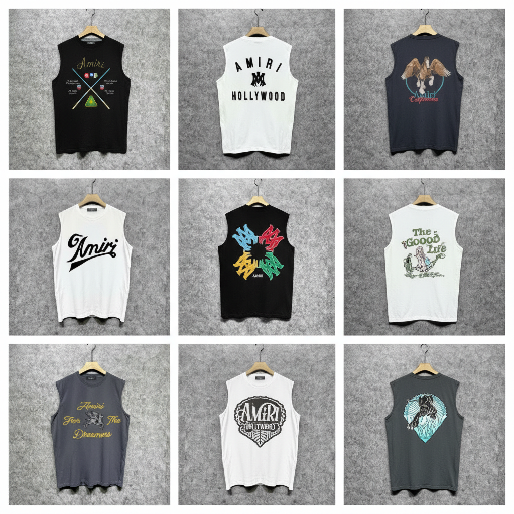 Amiri sleeveless graphic T-shirts featuring bold prints, Hollywood lettering, and unique streetwear designs for a stylish, comfortable, and trendy casual look.