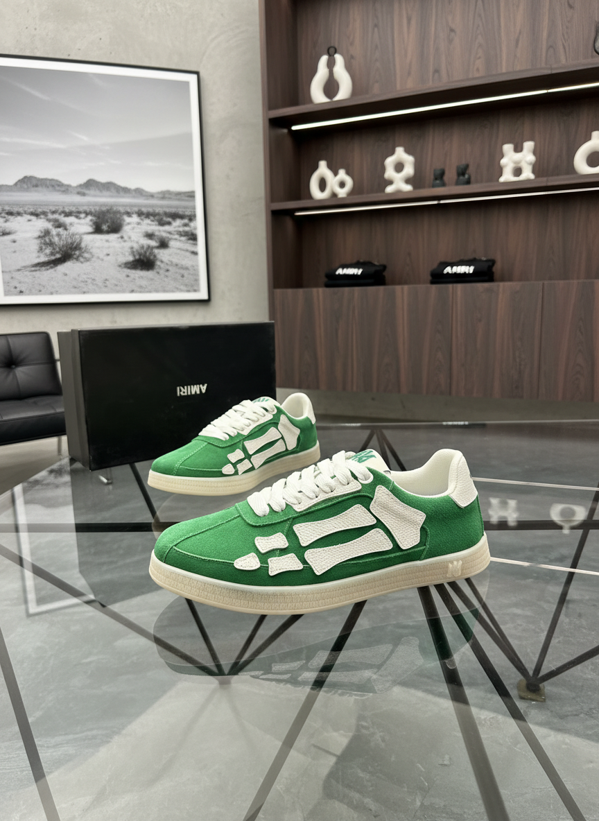 Amiri Green Suede Sneakers with White Leather Accents, Premium Casual Shoes Featuring Unique Design and Comfort for Everyday Streetwear Fashion.