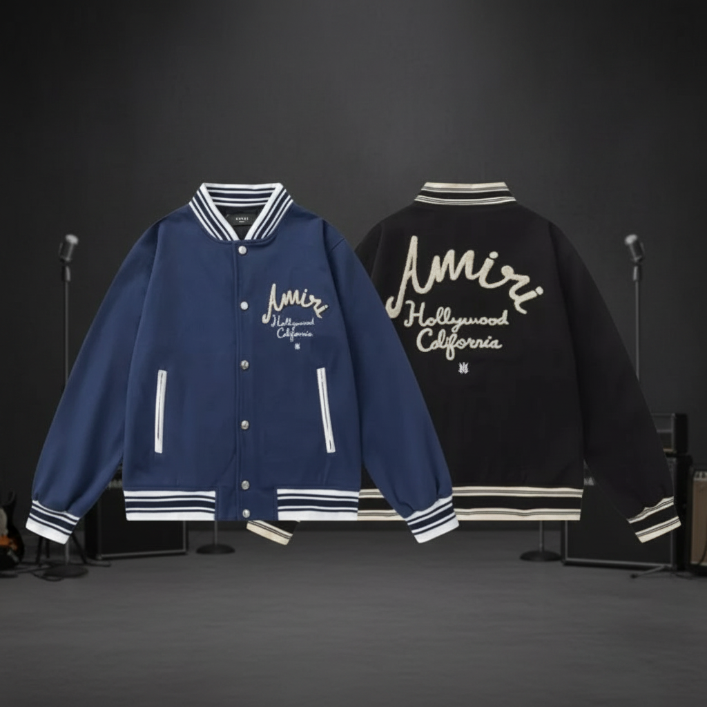 Amiri Hollywood California varsity jacket, stylish unisex design, premium quality, perfect for casual streetwear and layering in all seasons.