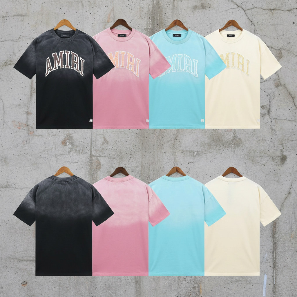 Amiri T-Shirt in black, pink, blue, and apricot, featuring bold logo print, casual style, and premium cotton for comfort, perfect for streetwear and everyday fashion.