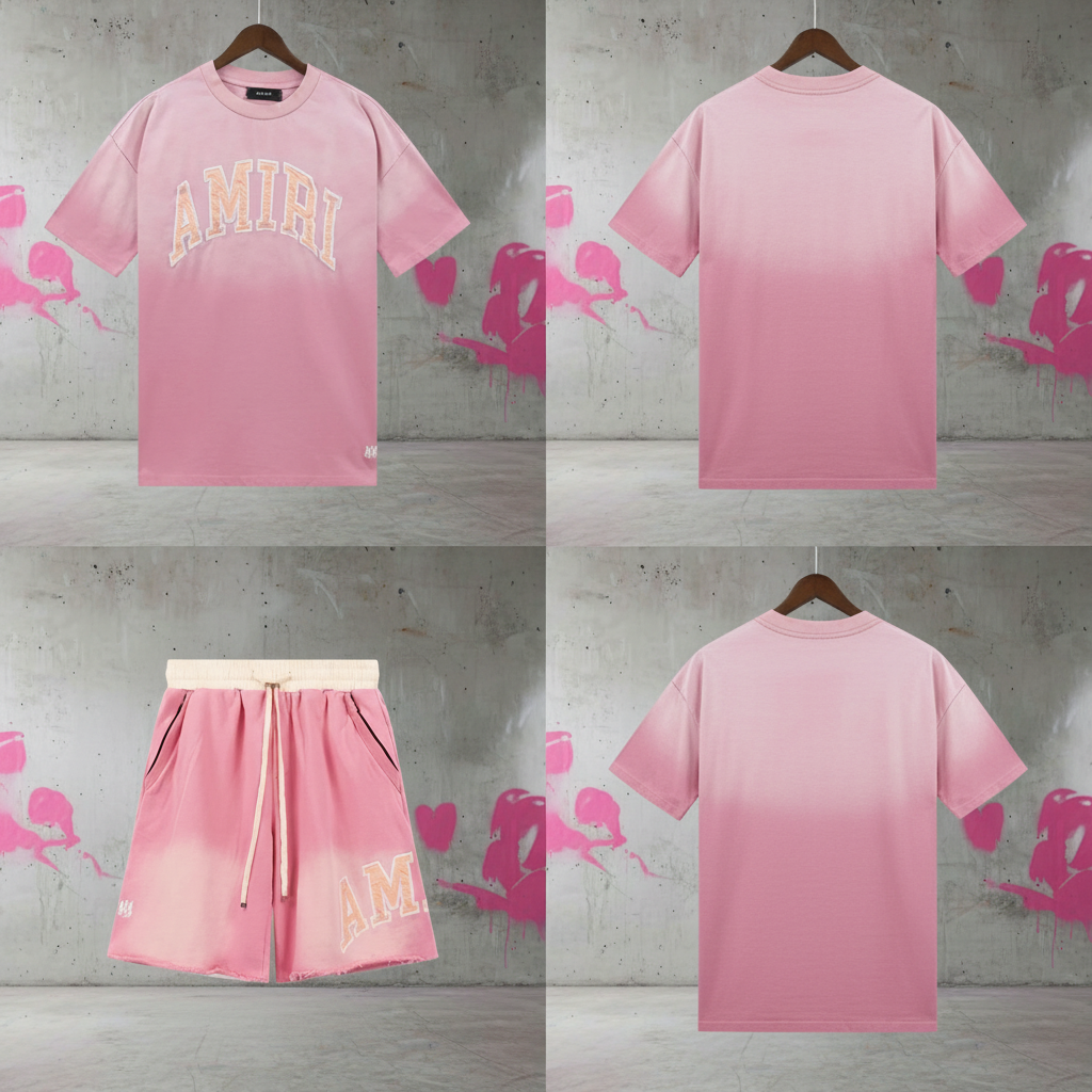 Amiri Pink Ombre T-Shirt and Shorts Set, stylish casual wear with bold logo print, soft cotton fabric, perfect for summer street fashion.