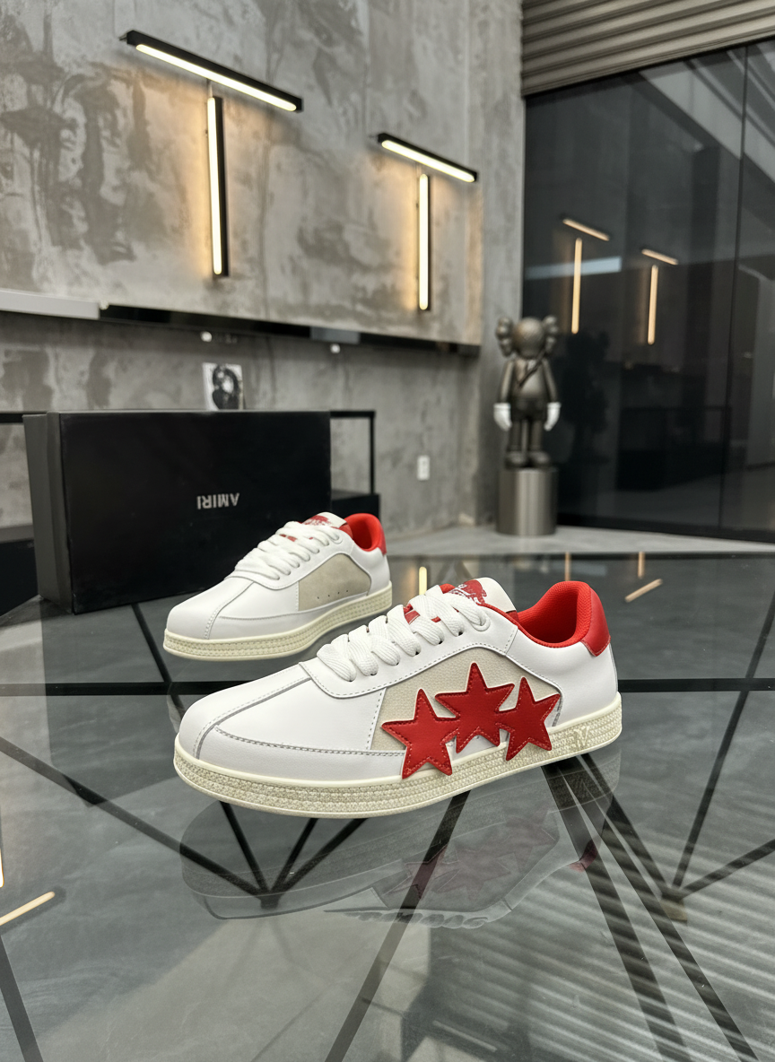 AMIRI White Leather Sneakers with Bold Red Star Design, Comfortable Low-Top Casual Shoes for Men, Stylish Streetwear Fashion