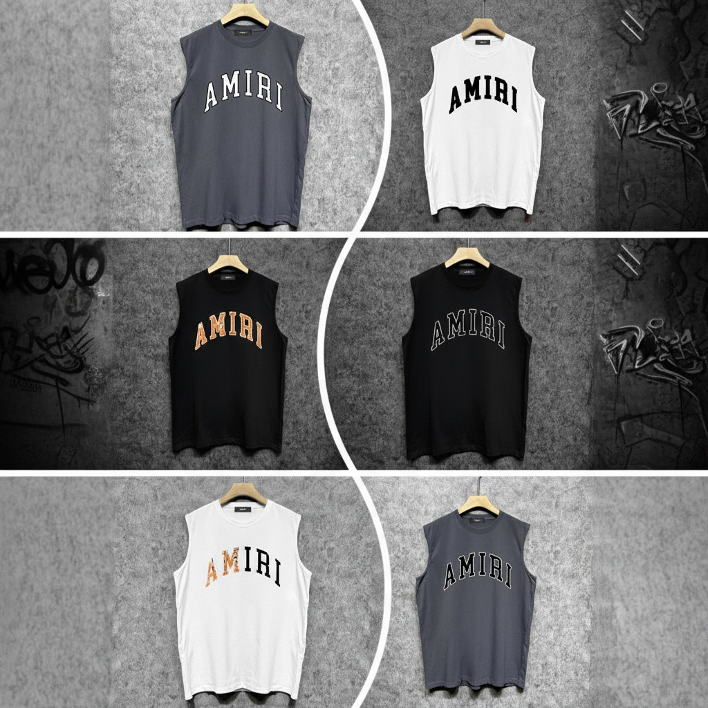 Amiri sleeveless cotton T-shirt, stylish summer casual top with bold logo print, breathable fabric, perfect for streetwear and everyday fashion.